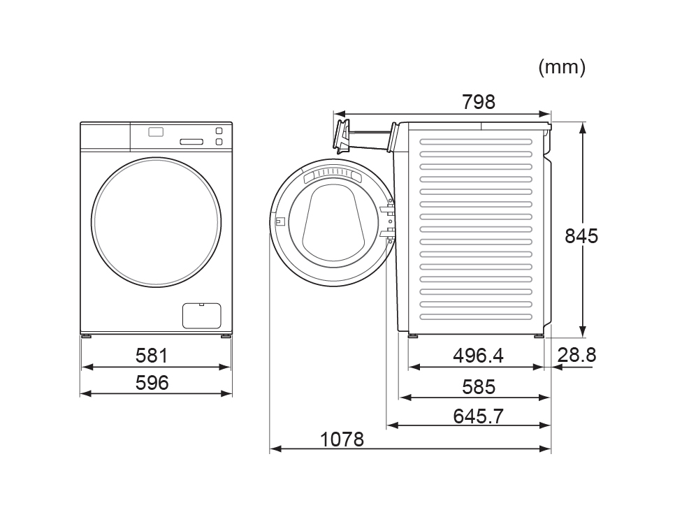 - H: 845mm, W: 596mm, D: 645.7mm, Weight: 69kg. *Please check the minimum space requirements for installation, in diagram below.
