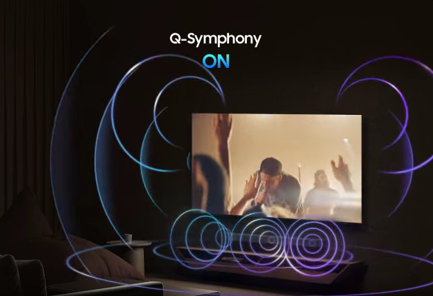 Surround yourself with beautifully orchestrated sound. Samsung technology syncs the TV and soundbar audio* to play simultaneously – without muting the speakers of either device.