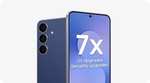A Samsung Galaxy S25 FE smartphone with a Navy back and triple rear cameras is shown. The screen displays ‘7x OS Upgrades Security upgrades’, highlighting extended software and security support.