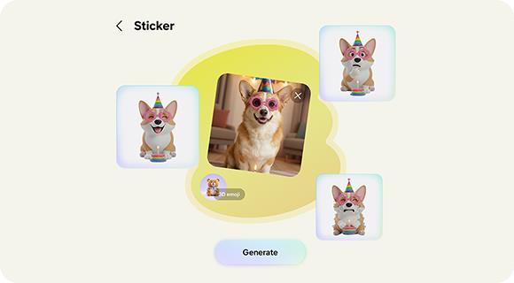 Mix sketches or photos with text that match your imagination. With a simple text description or a rough sketch outline, Galaxy AI produces the creations. Then, add the stickers to your keyboard or share it with your friends.